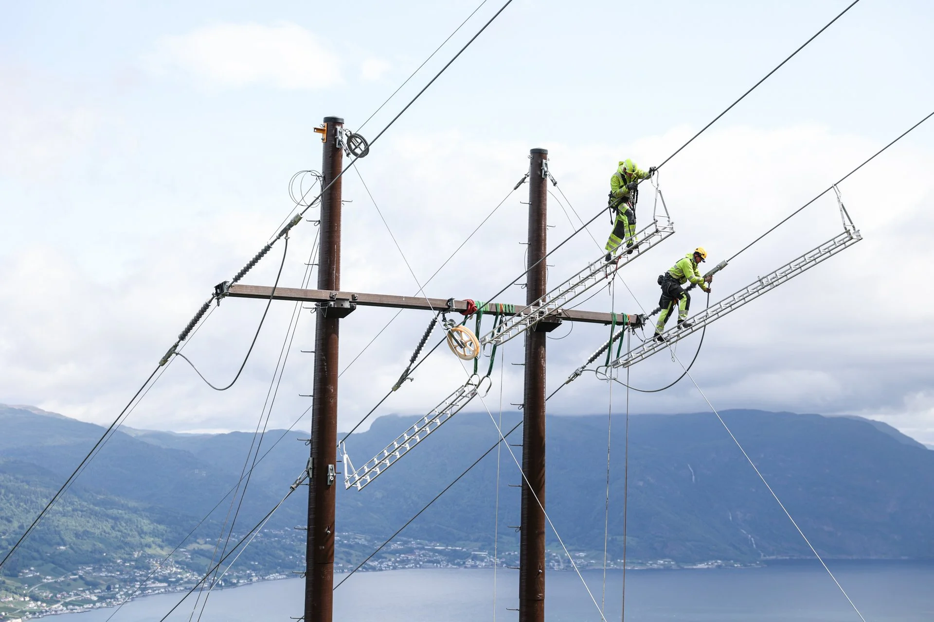 – No har me strekt alle linene til endes, no festar me dei i toppen av mastene. Det vil gå framover mot midten av sommaren, og så er me klare for spenningssetting ikkje så lengje etter det.