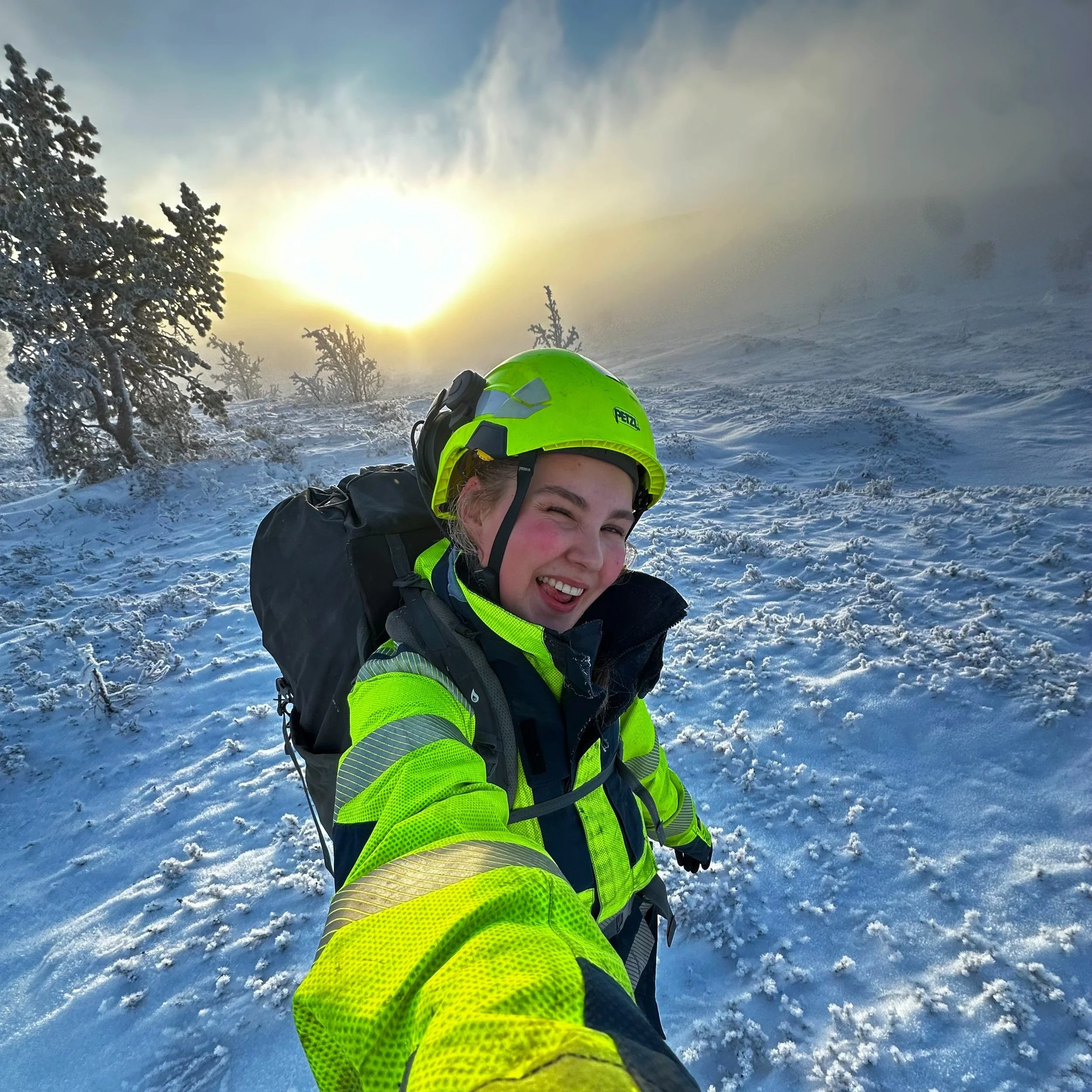 Tidlegare i år byrja ho som energimontørlærling for Sygnir, på montørbasen i Vik. I haust og inn mot vinteren har ho jobba mykje på det spennande linjebyggingsprosjekt i Feios, der Sygnir byggjer 132 kv linje frå Feios Kraftverk til Dagshovden i Vik.